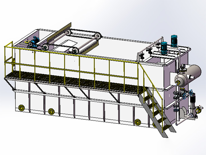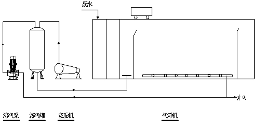 該裝置主要起固液分離作用,去除廢水中的懸浮物(SS)、油污、色度,同時可以降低COD、BOD等污染物,主要利用溶氣系統(tǒng)產(chǎn)生的溶氣水中的微氣泡,與水中的懸浮物絮體碰撞粘合在一起,形成“微小氣泡—懸浮物復(fù)合體”,該“微氣泡—懸浮物復(fù)合體”逐漸共聚,體積變大,形成比重小于1的“氣泡—懸浮物復(fù)合體”。溶氣水在 0.3-0.5MPa的工作壓力的情況下,使空氣Max限度地溶入水中,通過減壓釋放,形成直徑在20μm-30μm左右的微小氣泡。
